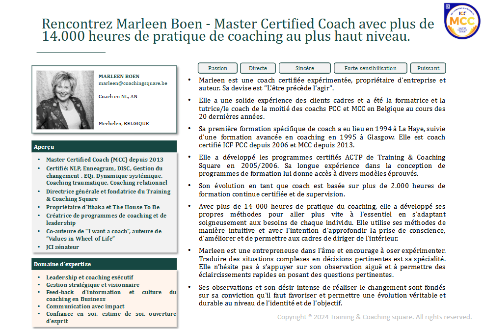 Rencontrez Marleen Boen – Master Certified Coach avec plus de 14.000 heures de pratique de coaching au plus haut niveau.