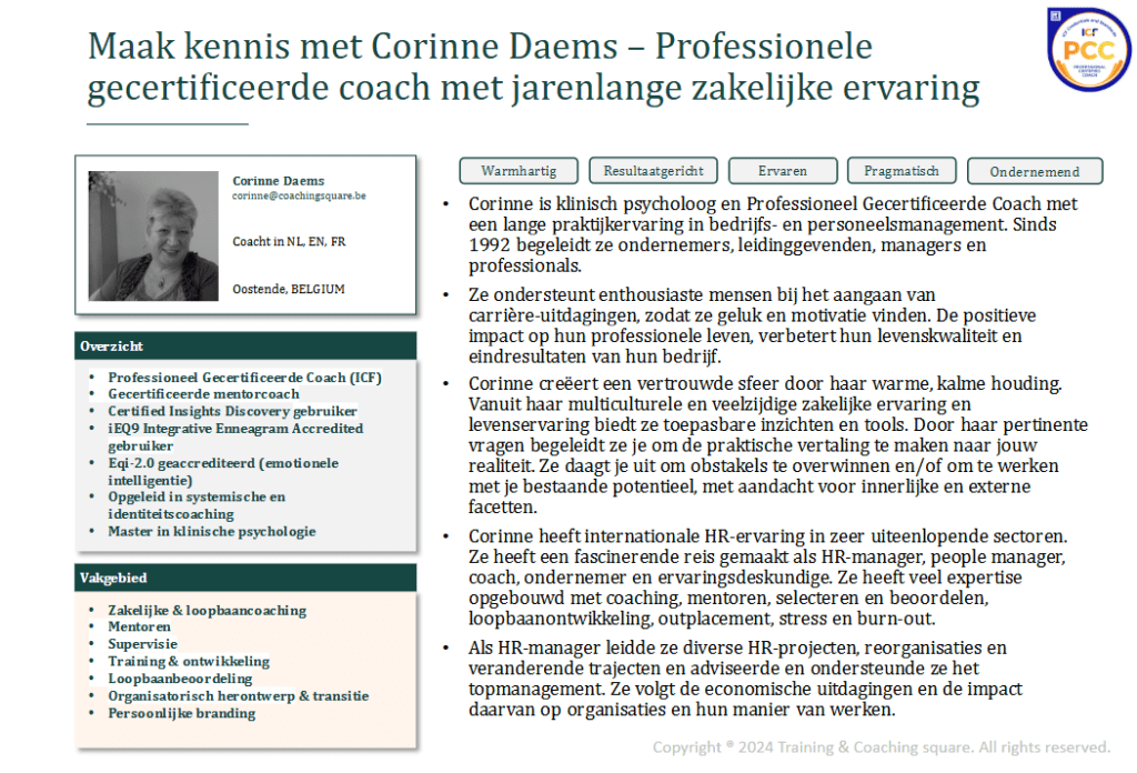 - Professioneel Gecertificeerde Coach (ICF)