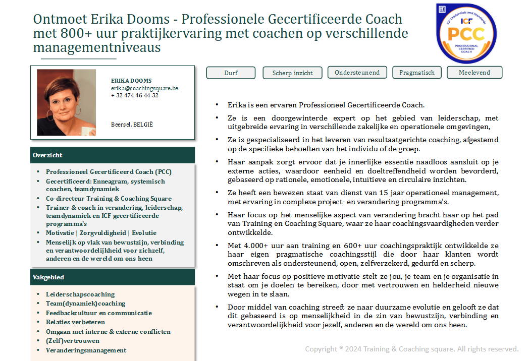 Ontmoet Erika Dooms – Professionele Gecertificeerde Coach met 800+ uur praktijkervaring met coachen op verschillende managementniveaus
